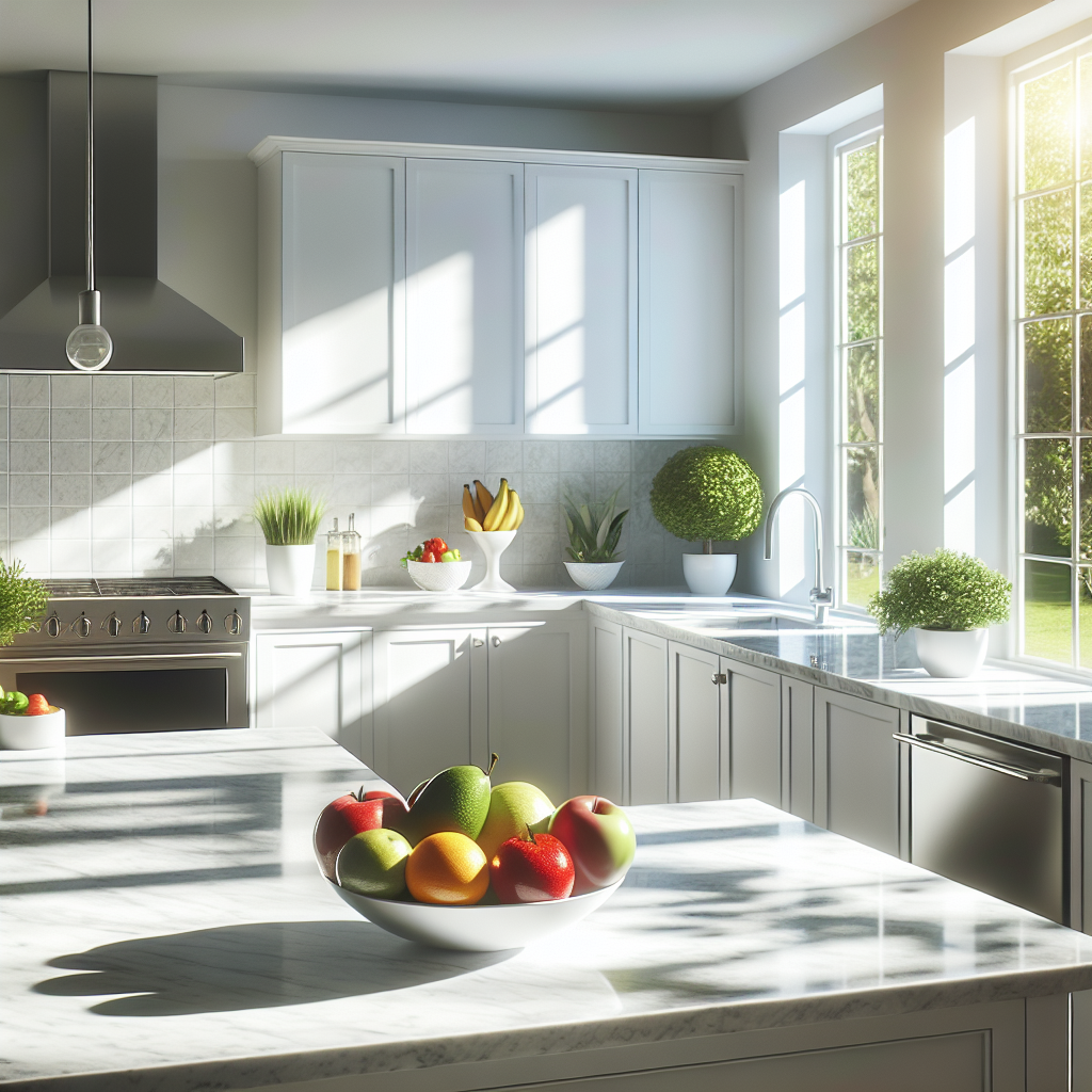 Step into a kitchen that embodies simplicity and elegance, where every element serves a purpose. The image showcases a pristine white kitchen with clean countertops, a few essential cooking tools, and a bowl of fresh fruits. The sunlight streaming through the window highlights the textures of the marble and the gleam of stainless steel appliances, all harmonizing to create a space that invites culinary creativity without distraction.