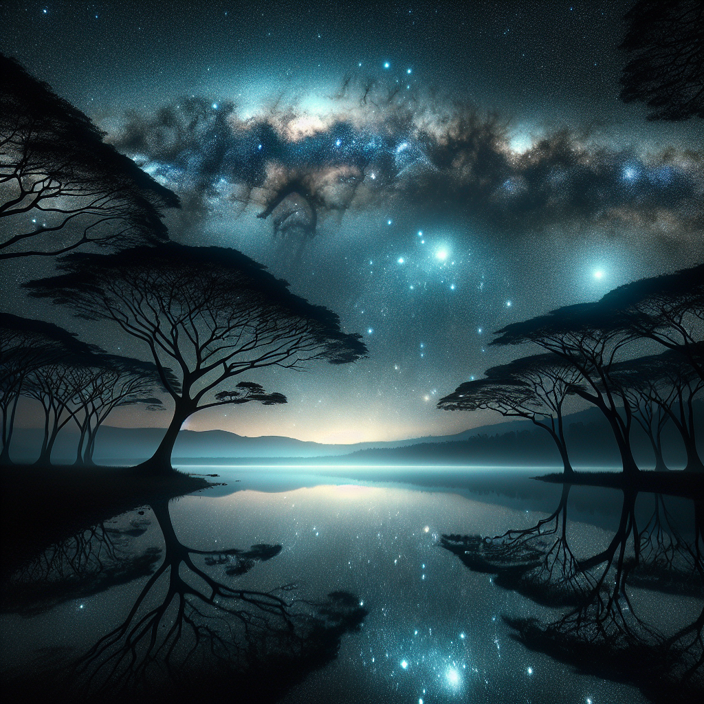 Immerse yourself in the wonders of the night sky, where a dazzling display of stars twinkles above. The Milky Way stretches across the horizon, its ethereal glow illuminating the landscape below. Silhouetted trees frame the scene, while a serene lake mirrors the cosmic spectacle, creating a magical and tranquil night.