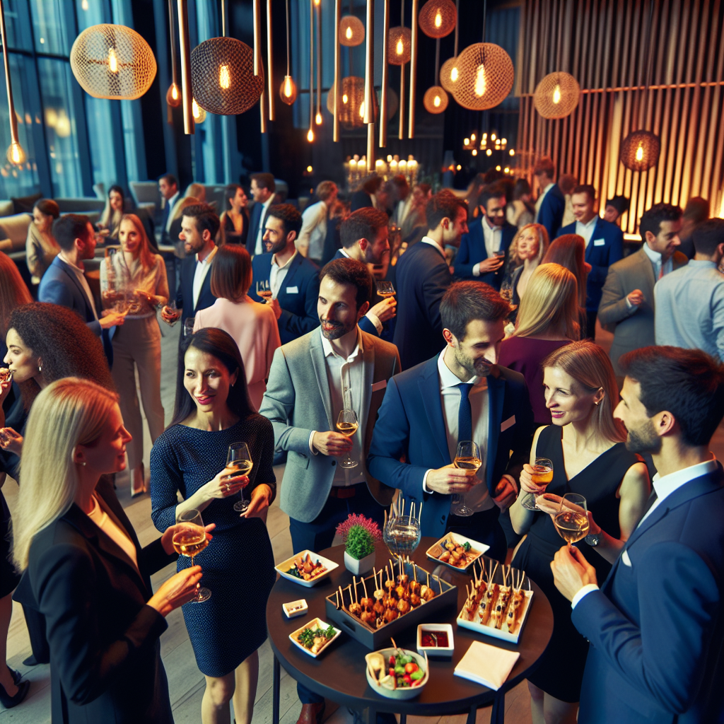 Experience the lively atmosphere of a corporate networking event in a stylish venue. Clusters of professionals engage in animated conversations, exchanging business cards amid laughter and the clinking of glasses. Elegant decor featuring soft lighting and modern furnishings creates an inviting environment for connection. The air is filled with the promise of new partnerships and exciting collaborations.