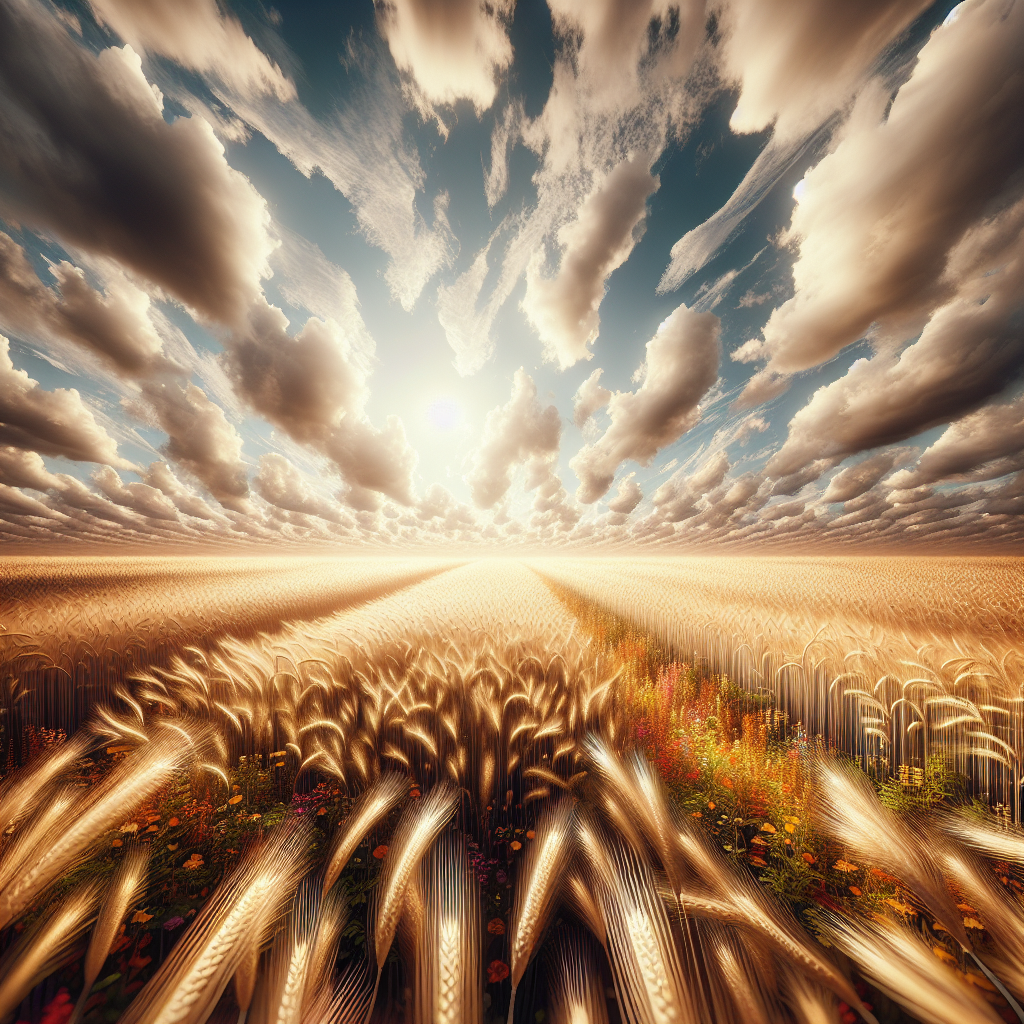 Immerse yourself in the golden glow of a sprawling wheat field under a late summer sun. The tall stalks sway gently in the breeze, creating a mesmerizing wave-like effect. Scattered wildflowers add splashes of color, while fluffy clouds drift lazily overhead, embodying the simple beauty and serenity of rural life.