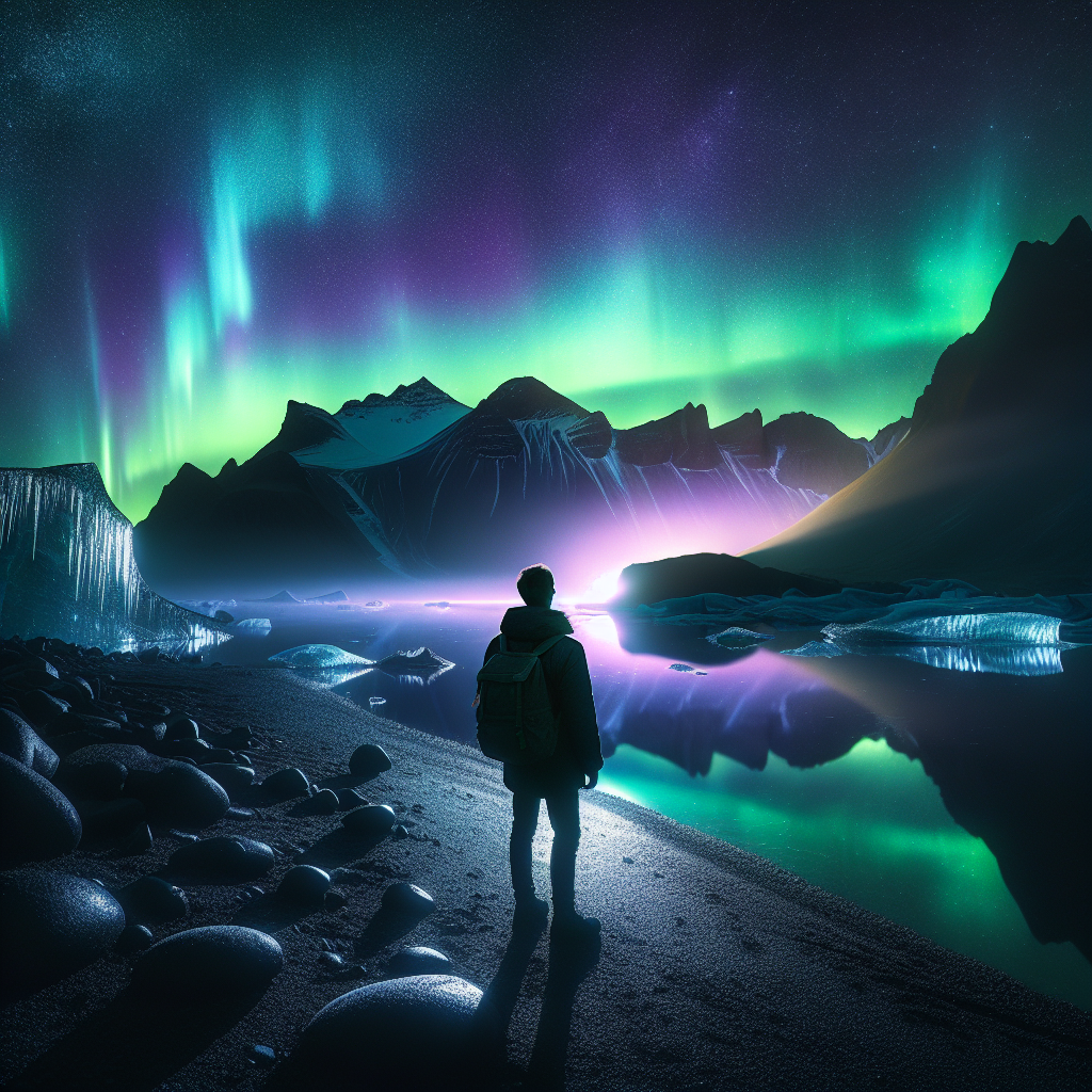 Venture into the mystical landscapes of Iceland, where the night sky comes alive with the mesmerizing dance of the Northern Lights. A lone traveler stands in awe against a backdrop of rugged mountains and a shimmering glacial lake, as vibrant greens and purples swirl overhead in a celestial display.