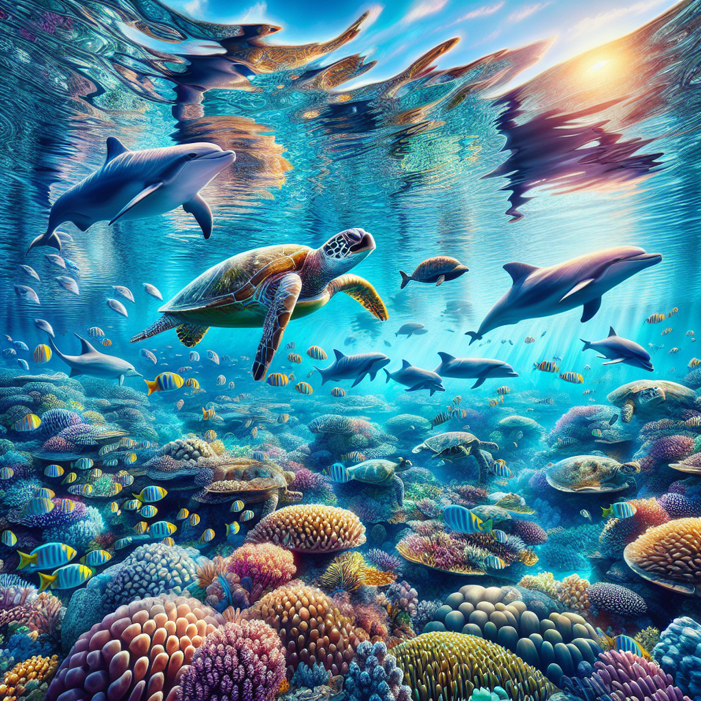 Dive into the tranquil depths of a crystal-clear ocean where vibrant coral reefs thrive. Schools of fish dart among colorful corals, and sunlight filters through the water, creating a dance of light and shadow. The scene is alive with the beauty of marine life, from graceful sea turtles gliding by to playful dolphins leaping above the surface.