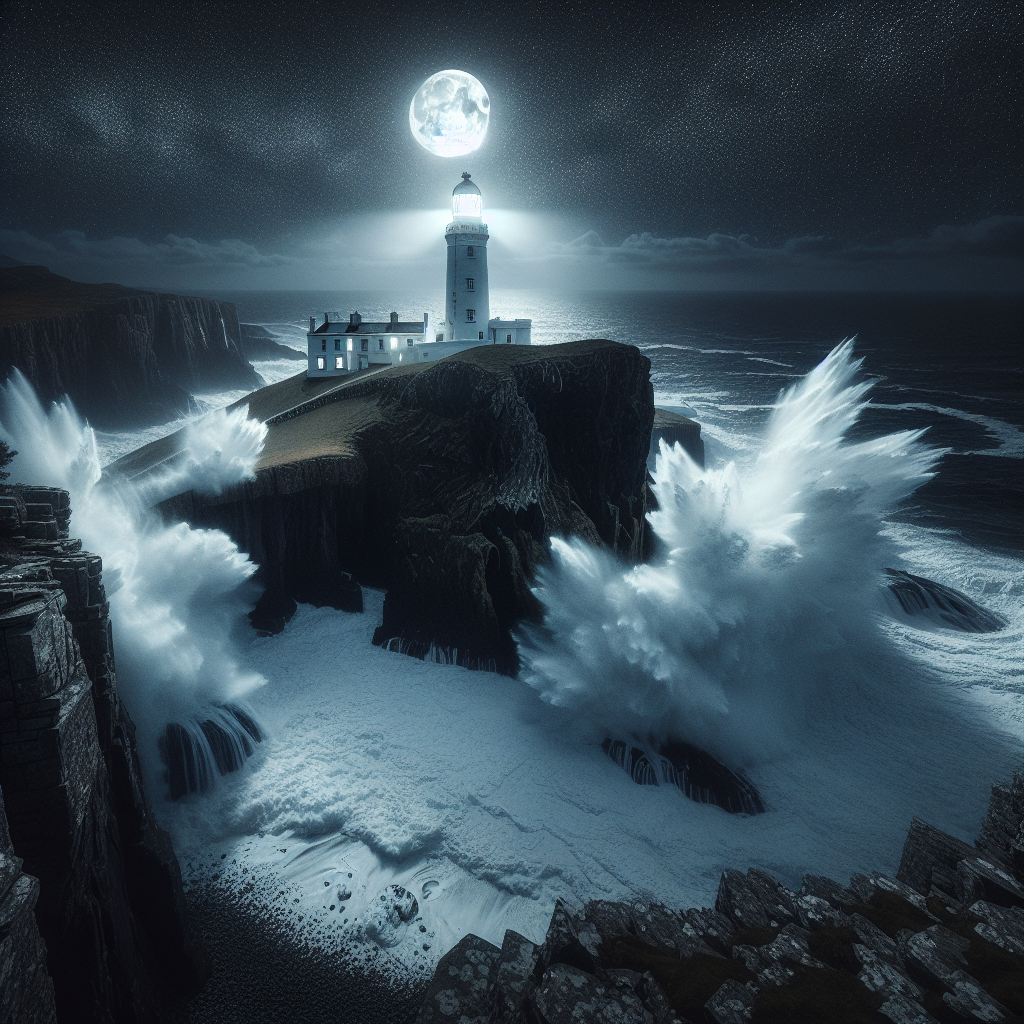 A solitary lighthouse stands guard over a rocky coastline, its beam piercing the night. The dark ocean waves crash violently against the cliffs, while a full moon casts a silvery hue, illuminating the scene with a sense of gravity and mystique.
