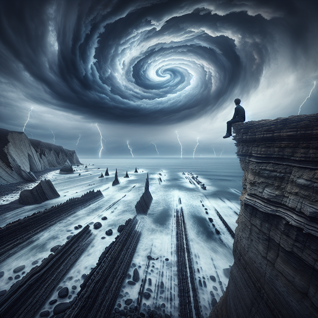 Experience the allure of solitude with this striking composition that showcases a lone figure standing on the edge of a desolate cliff. The dark, turbulent sea crashes against jagged rocks below, while a stormy sky looms overhead. Flickers of lightning illuminate the scene, casting dramatic shadows. This artwork is a powerful representation of introspection, courage, and the raw beauty of nature’s fury.