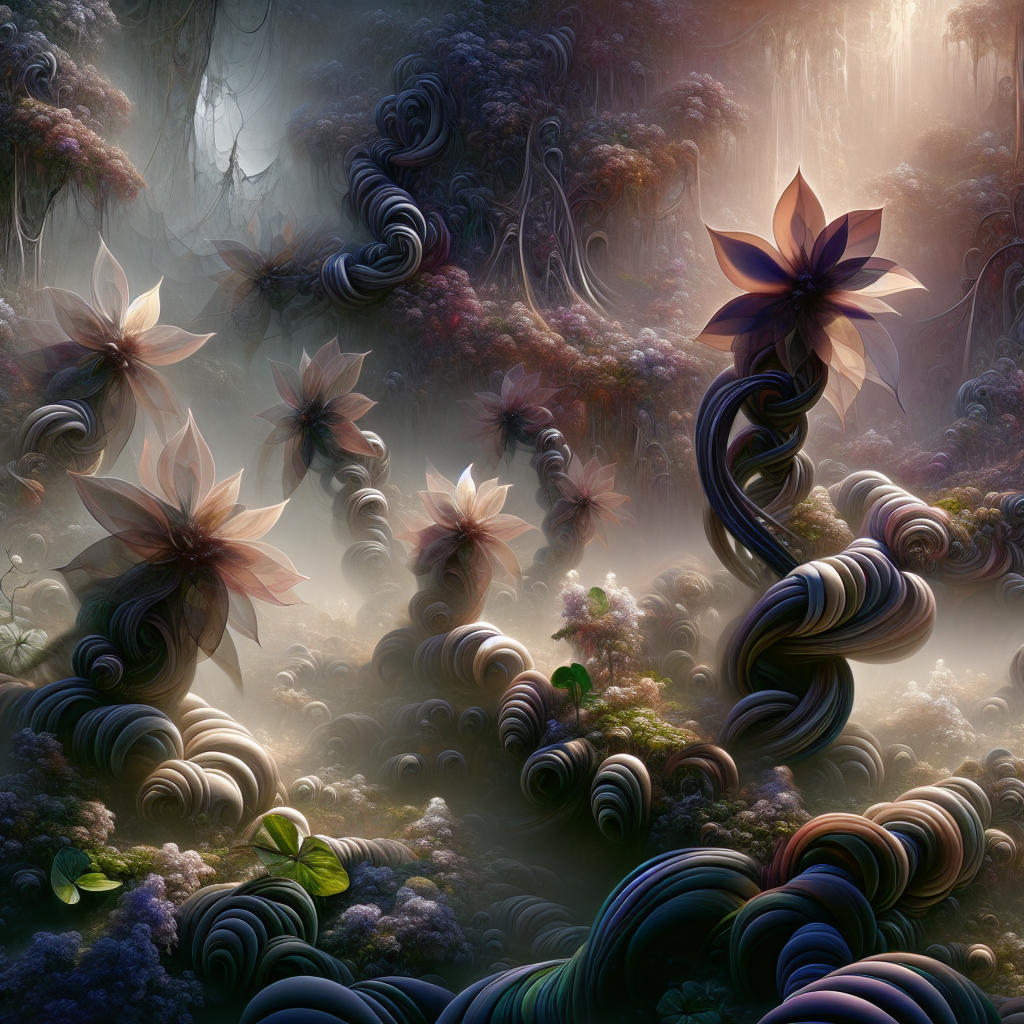 A secret garden shrouded in mist, where twisted vines and dark blooms intertwine. Ghostly apparitions of flowers emerge from the shadows, their petals ethereal and translucent, offering a glimpse into a world where beauty and the supernatural coexist.