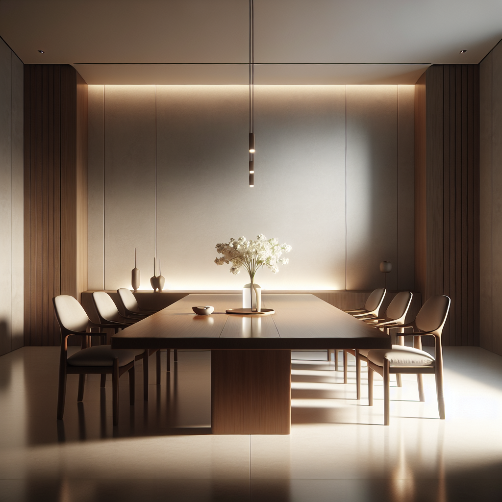Visualize a sophisticated yet minimal dining space with a long, polished wooden table set for two. A simple vase with a single white flower graces the center, while soft, ambient lighting casts gentle shadows. The minimalist chairs are elegantly crafted, completing the serene dining experience.