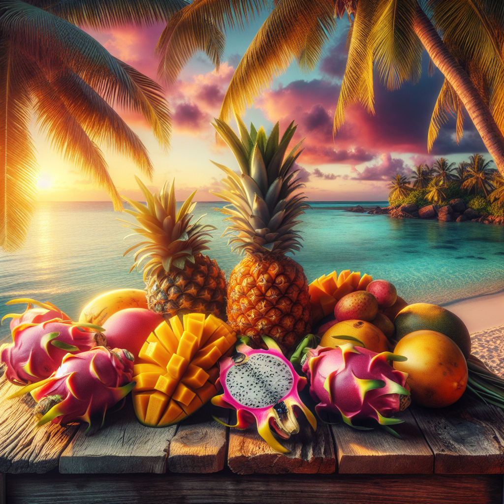 An explosion of color with a selection of exotic fruits including ripe mangoes, juicy pineapples, and vibrant dragon fruits arranged artfully on a beachy wooden table. The scene is set against a backdrop of azure waters, with palm fronds swaying gently in the breeze, capturing the essence of a tropical getaway.