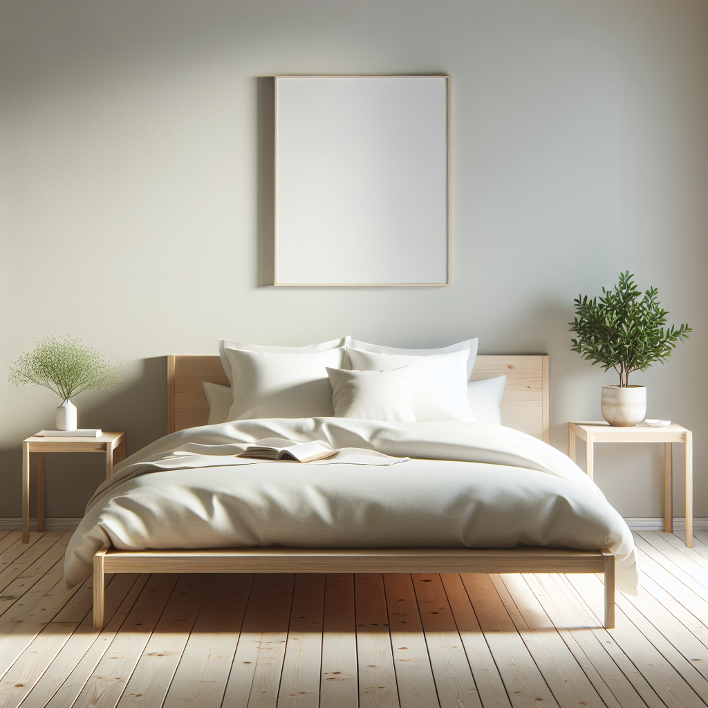 Embrace the essence of tranquility with this minimalist bedroom scene. The room features a low platform bed with crisp white linens, a single wooden bedside table with a small plant, and soft, diffused lighting that creates a warm atmosphere. The walls are a soothing pale gray, and a simple piece of abstract art hangs above the bed, providing visual interest without overwhelming the senses.